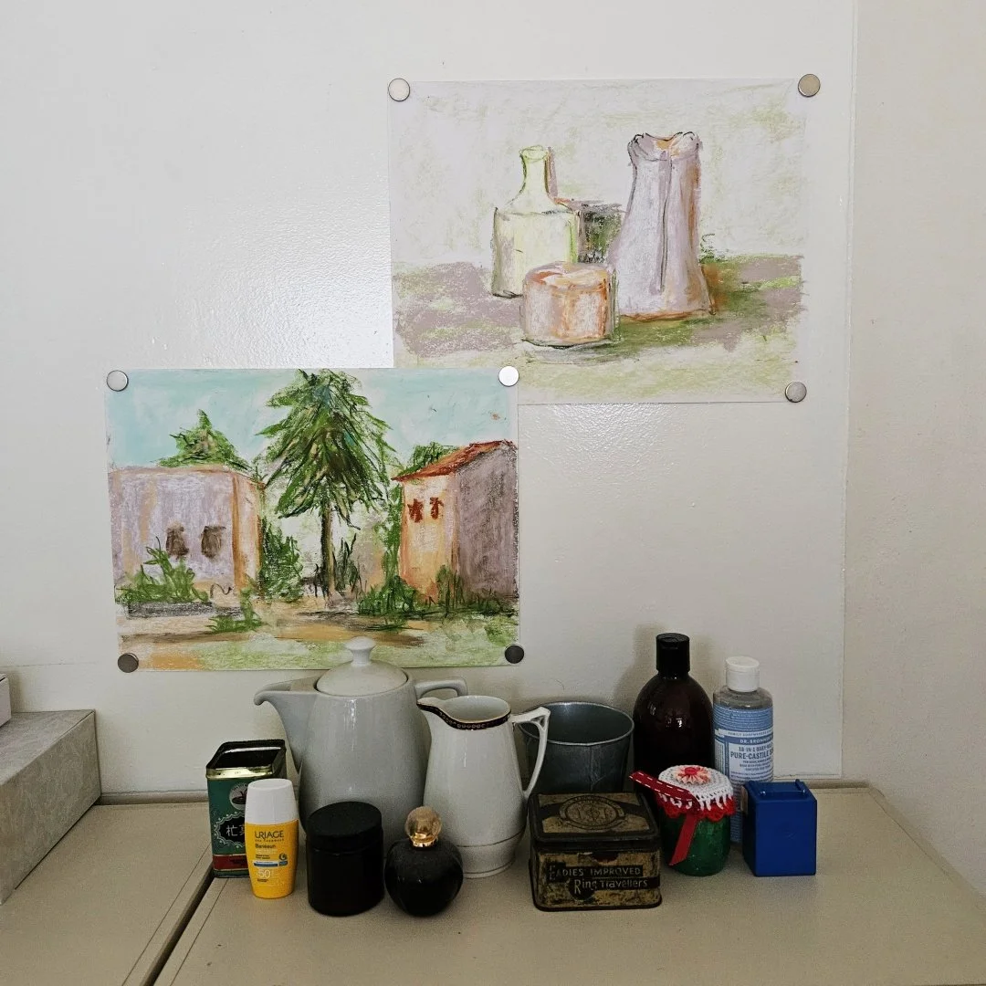 En ja, ik heb een landschap à la Morandi getekend met pastelkrijt. Ik heb mij daarvoor gebaseerd op mijn schetsen en verder een beetje uit mijn geheugen wat ik op mijn wandelingen met Eino zoal zie.