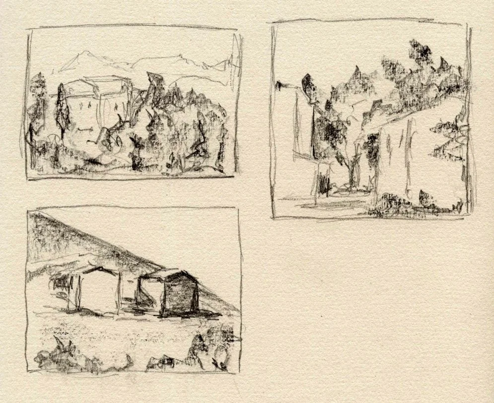 Net als zijn stillevens heeft hij zijn landschappen sterk vereenvoudigd. Dat valt vooral op bij de huizen die soms niet meer zijn dan een gekleurd volume. Dat vind ik interessant omdat ik op veel van mijn wandelingen altijd wel één of ander huis in mijn blikveld heb. Bij het tekenen of schilderen liet ik dat meestal weg. Zal ik nu niet meer doen.