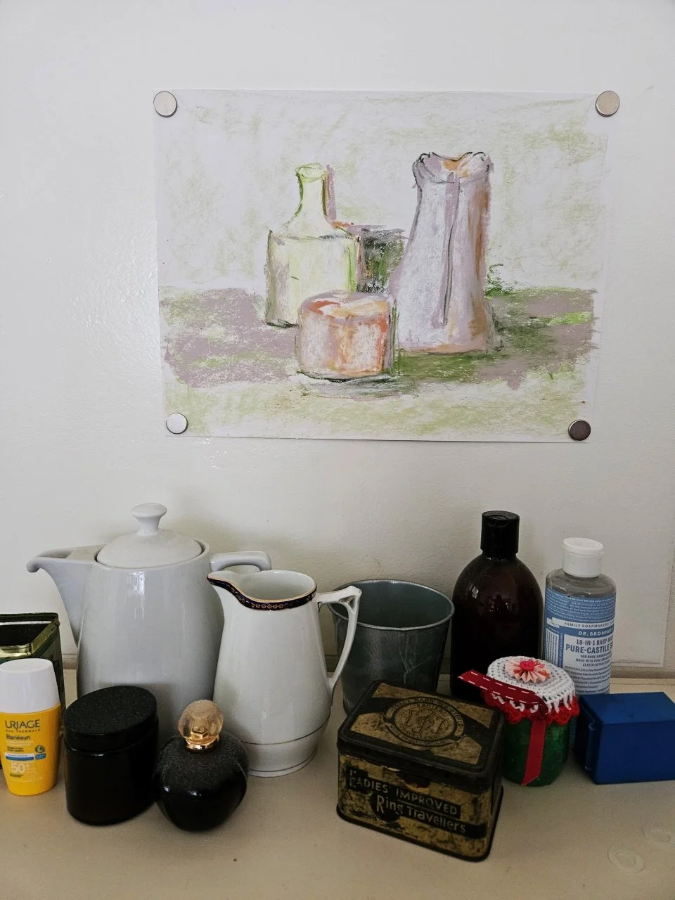En omdat de workshop in de Kunst-Bloem nu echt wel nadert heb ik een stilleven van Morandi nagetekend. Ondertussen heb ik ook een verzameling potjes, flesjes en doosjes aangelegd. Ik zal dus mijn eigen ‘Morandi’ werkjes maken.