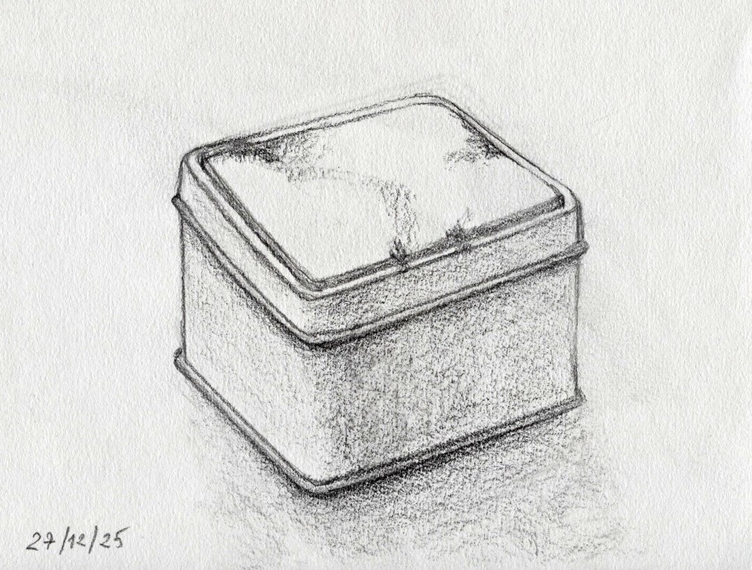 Maar ik heb wel iets om te tonen: twee tekeningen die ik een tijdje geleden gemaakt heb en dan weer vergeten. En nu teruggevonden en gescand. Een beeldje en een doosje. Wie bij het beeldje op rare gedachten komt, het ziet er echt zo uit.