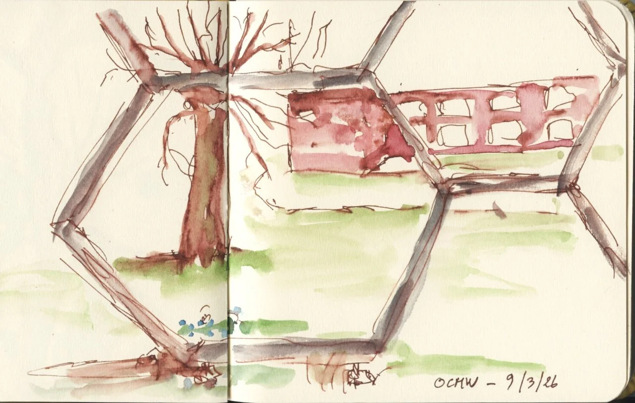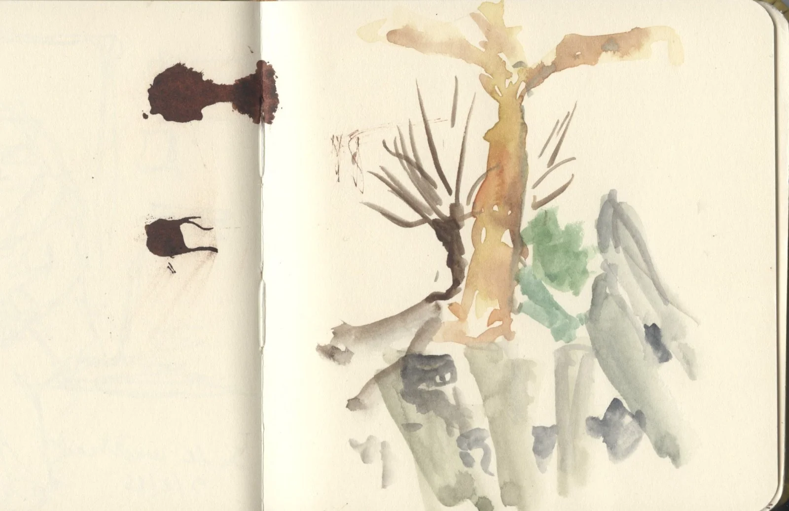 Deze namiddag is minder goed verlopen. Ik was met Eino op stap en had een bankje uitgekozen om een beetje te tekenen. Maar mijn vulpen schreef niet. Ik heb een beetje aan het schroefje gedraaid omdat ik dacht dat ze misschien uitgedroogd was en dan meteen een paar vlekken gemaakt op mijn schetsboekje 🙁. Daarna bleef de vulpen koppig weigeren. Dus maar met mijn aquarelletjes begonnen.