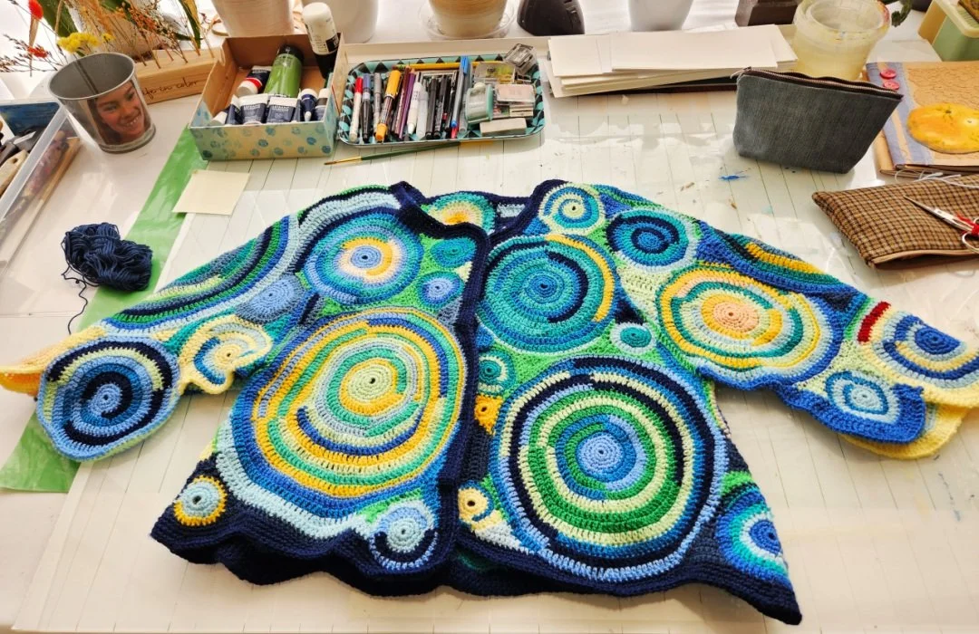 Daar staat mijn psychedelisch jasje te pronken. Het lijkt een beetje op een schilderijtje van wol gemaakt. Maar ik heb nog nooit zo lang aan een schilderij gewerkt als aan dat jasje. Het voelt zich waarschijnlijk goed zo tussen de kaders, grote blaren papier en het poppenhuis.
