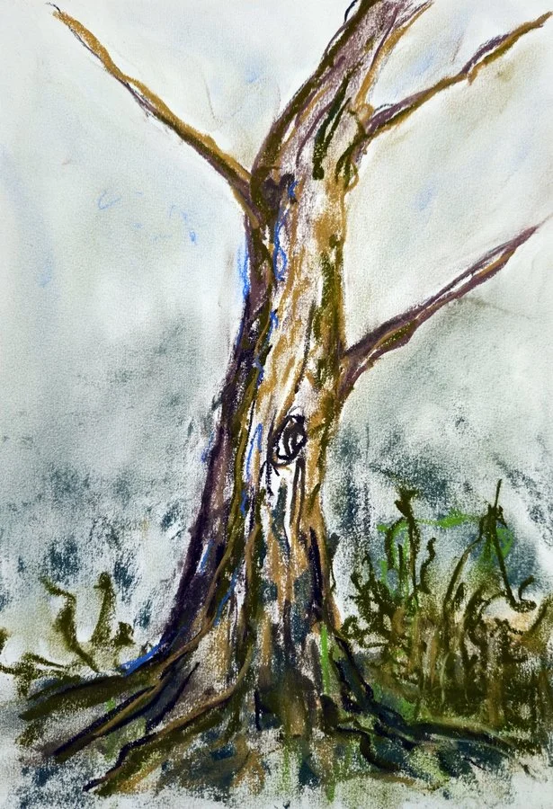 Teken een boom met een ander materiaal dan gewoonlijk: krijt, stift, wateroplosbare potloden, inkt... Hoe beïnvloedt dit je stijl? Wat verandert er?